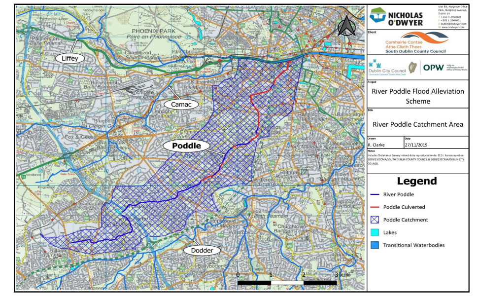 In response to the 2011 flood event and tragic death, a flood alleviation scheme (FAS) was designed for the river Poddle, and works are now underway after the FAS was approved by An Bord Pleanála in 2023. The €10m FAS (originally €7m) is managed by the OPW in conjunction with Dublin City Council (DCC), South Dublin County Council (SDCC) and consulting firm Nicholas O’Dwyer. It consists of a mix of hard and soft defences to be implemented at catchment level.