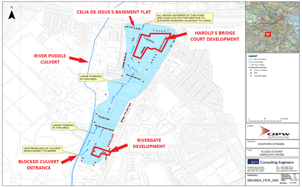 The Rivergate and Harold’s Bridge Court developments as located on the 2011 Harold’s Cross flood extent (red signposting added)